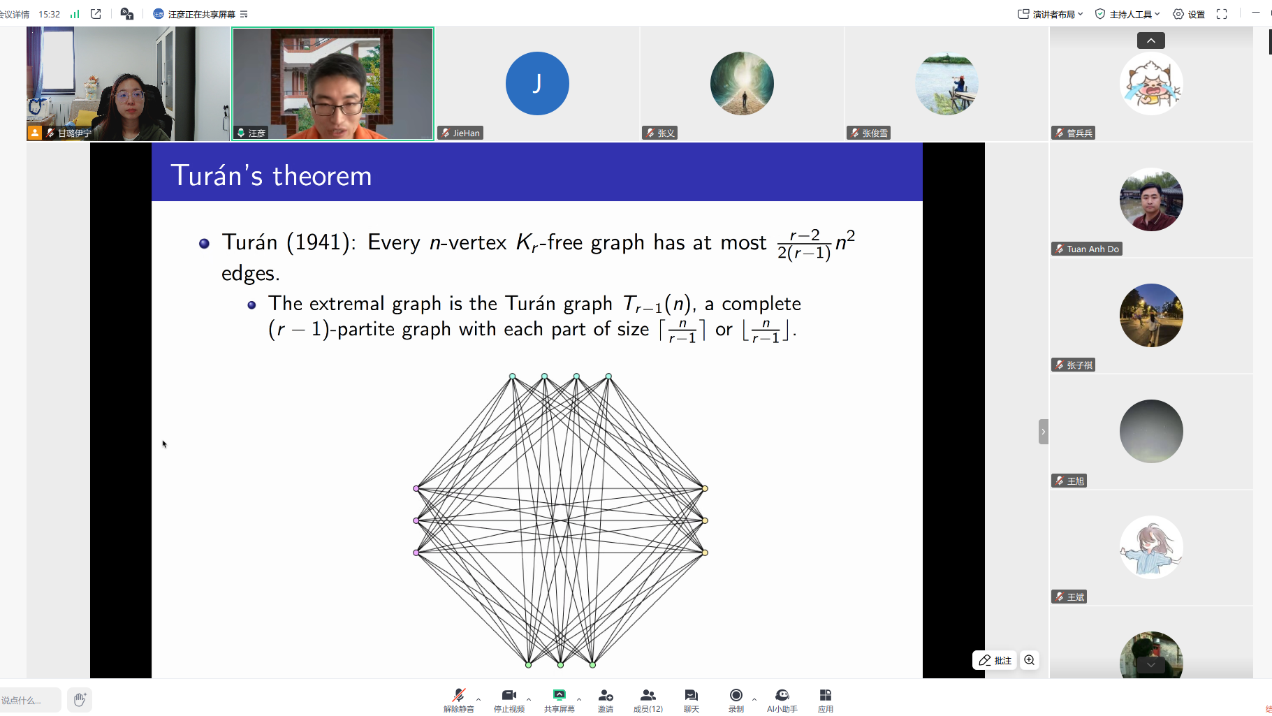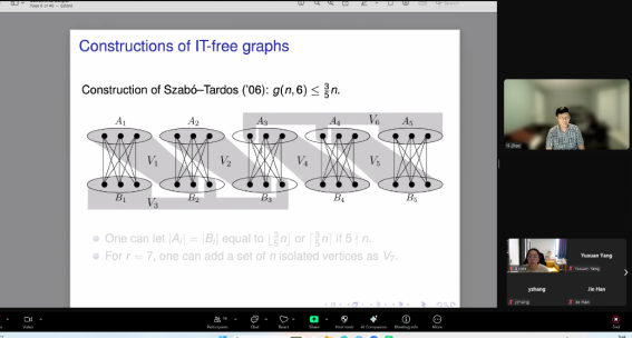2025年9月10日上午,由北京邮电大学学术委员会办公室、数学科学学院主办的2025年北京邮电大学“前沿邮我”系列学术报告之(三十一)通过线上Zoom视频会议形式举办。本场报告邀请了Yi Zhao教授作题为“Partial independent transversals in multipartite graphs”学术报告。报告由数学科学学院甘璐伊宁特聘研究员主持,20余位师生与会。 在报告中,Yi Zhao教授介绍了多部图中independent transversal的存在性系列...