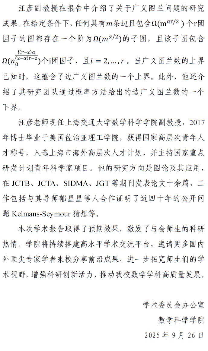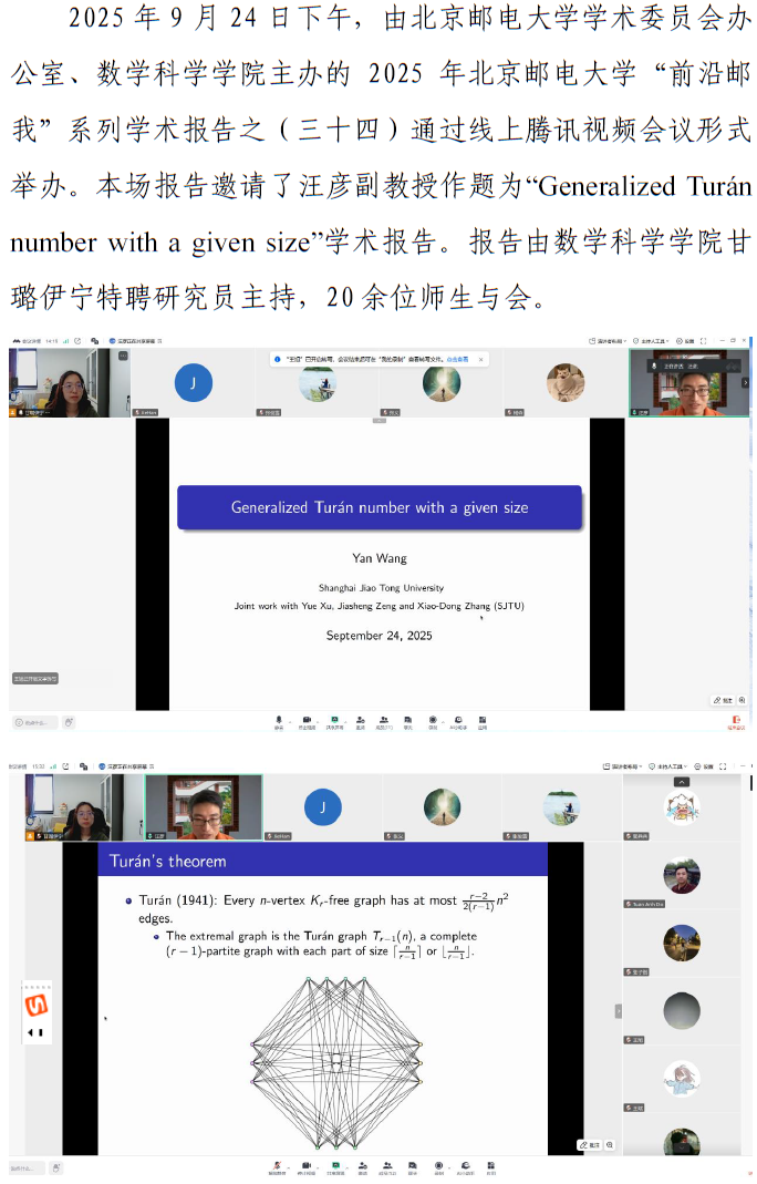 北京邮电大学“前沿邮我”系列学术报告之(三十四)“Generalized Turán number with a given size”成功举办