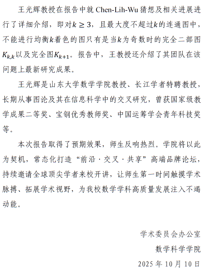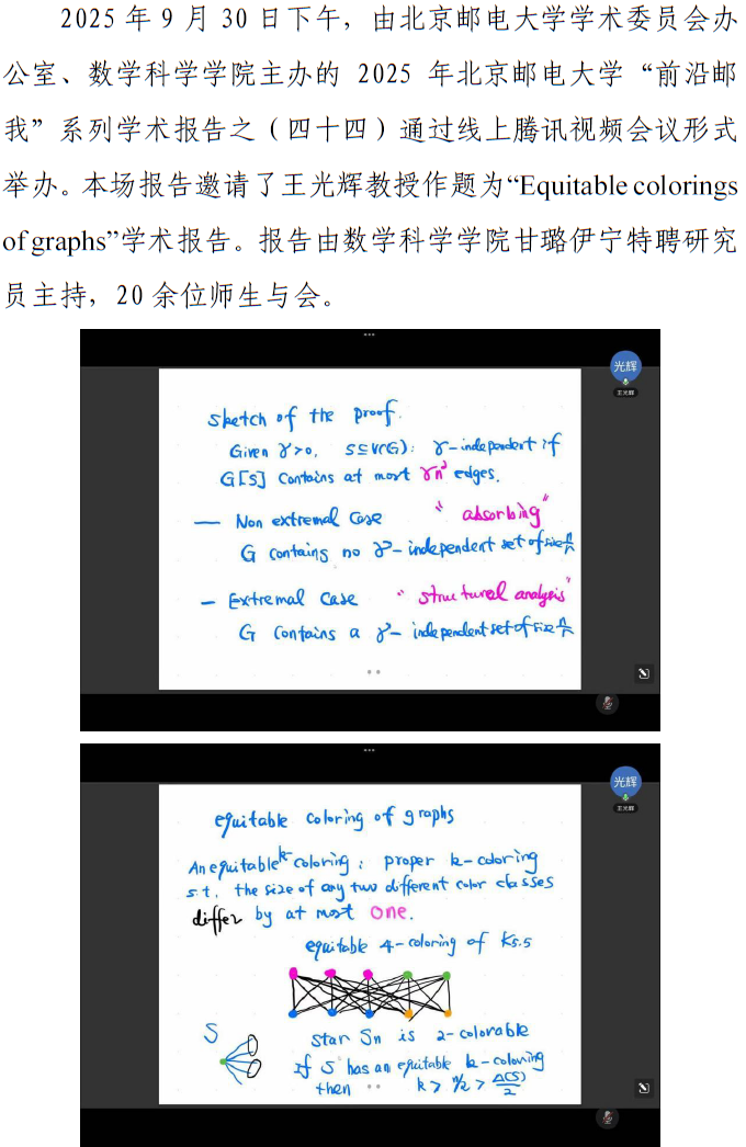 北京邮电大学“前沿邮我”系列学术报告之(四十四)“Equitable colorings of graphs”成功举办