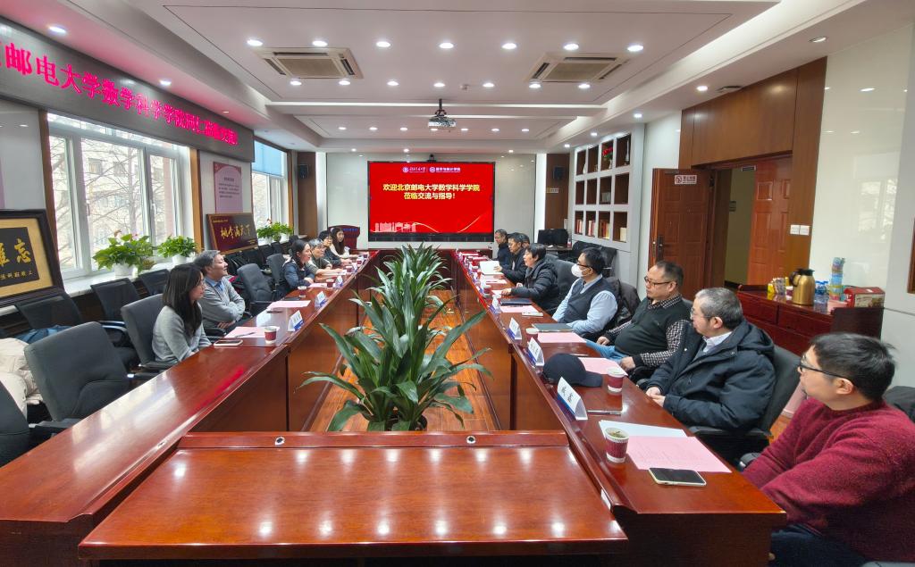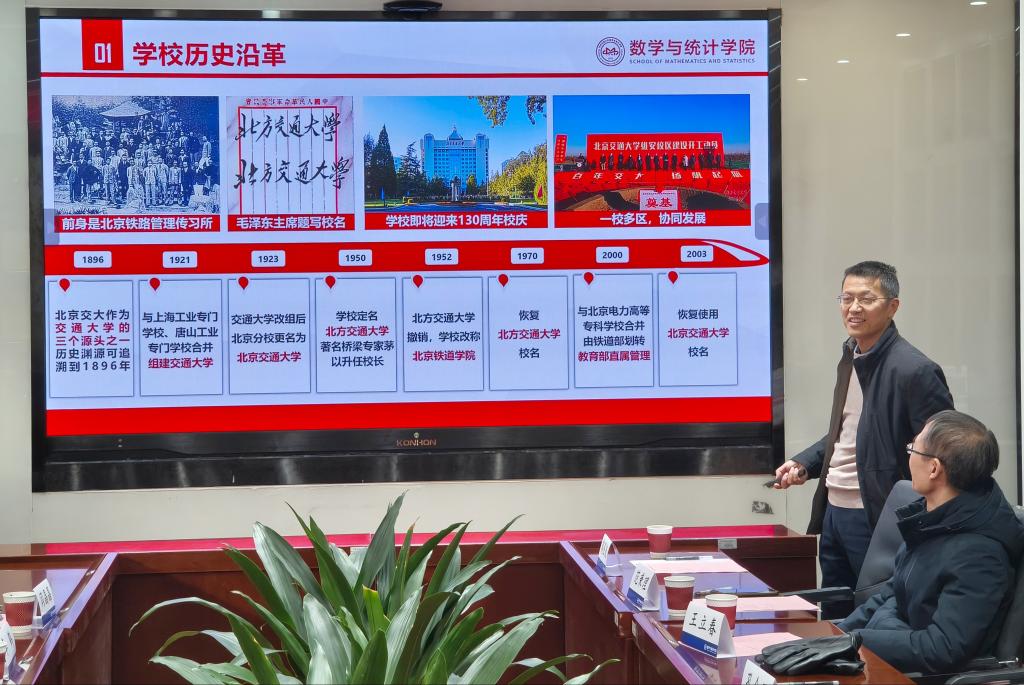 2025年1月9日下午,北京邮电大学数学科学学院副院长袁健华、应用数学系主任兼信息与计算科学专业负责人朱萍、大学数学竞赛负责人胡细宝、数学与信息科技科普实验室主任李鹤、概率与统计系副主任徐文哲、教学办主任闫晶晶一行6人,赴北京交通大学数学与统计学院开展调研交流活动。北京交通大学数学与统计学院领导班子、各实验室负责人、专业负责人及课程负责人出席会议。