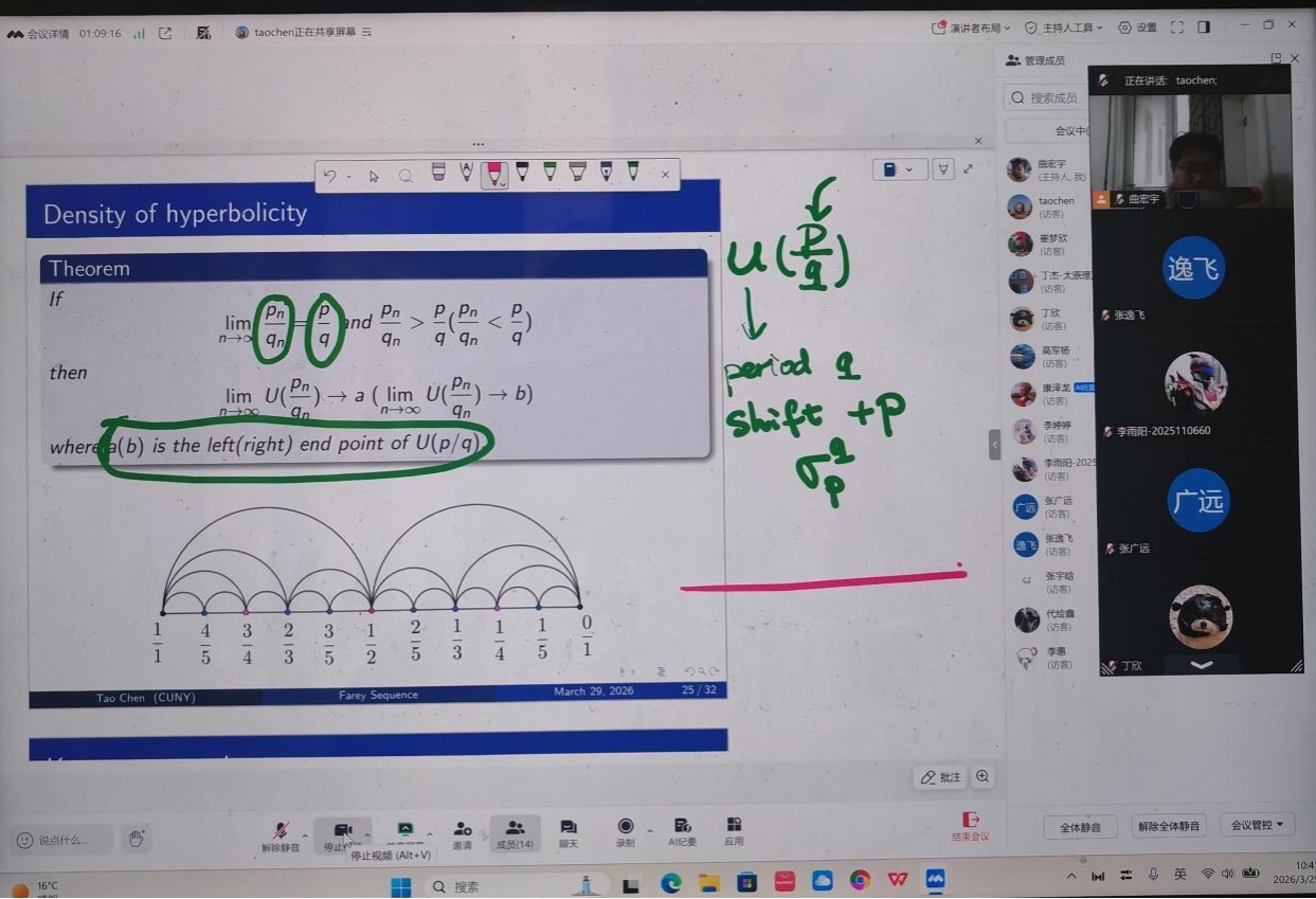 2026年3月29日下午,由北京邮电大学数学科学学院、数学与信息网络教育部重点实验室联合主办的第三届“数学文化节”系列学术报告第五场通过线上腾讯会议形式举办。本次报告邀请了纽约市立大学陈涛教授作题为“Farey Sequence and Dynamics”的精彩报告。本次报告由数学科学学院曲宏宇特聘副研究员主持,10余位师生与会。