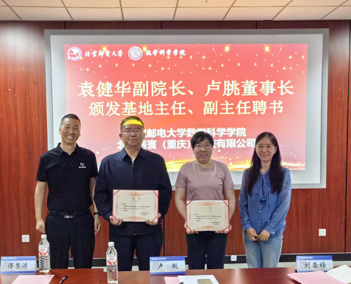 随后,学校国内合作与成果转化处副处长傅慧源与卢朓董事长共同为基地揭牌。副院长袁健华宣读了数学科学学院聘任仝辉副教授为基地主任、张鹏副教授为副主任的决定,并和董事长卢朓共同为主任颁发了聘书。北太振寰总裁廖汉卿以“北太天元产学研基地共建产学融合的路径探索与实践”为题作了专题报告并介绍了未来与北邮的合作规划。基地主任仝辉汇报了基地建设规划。