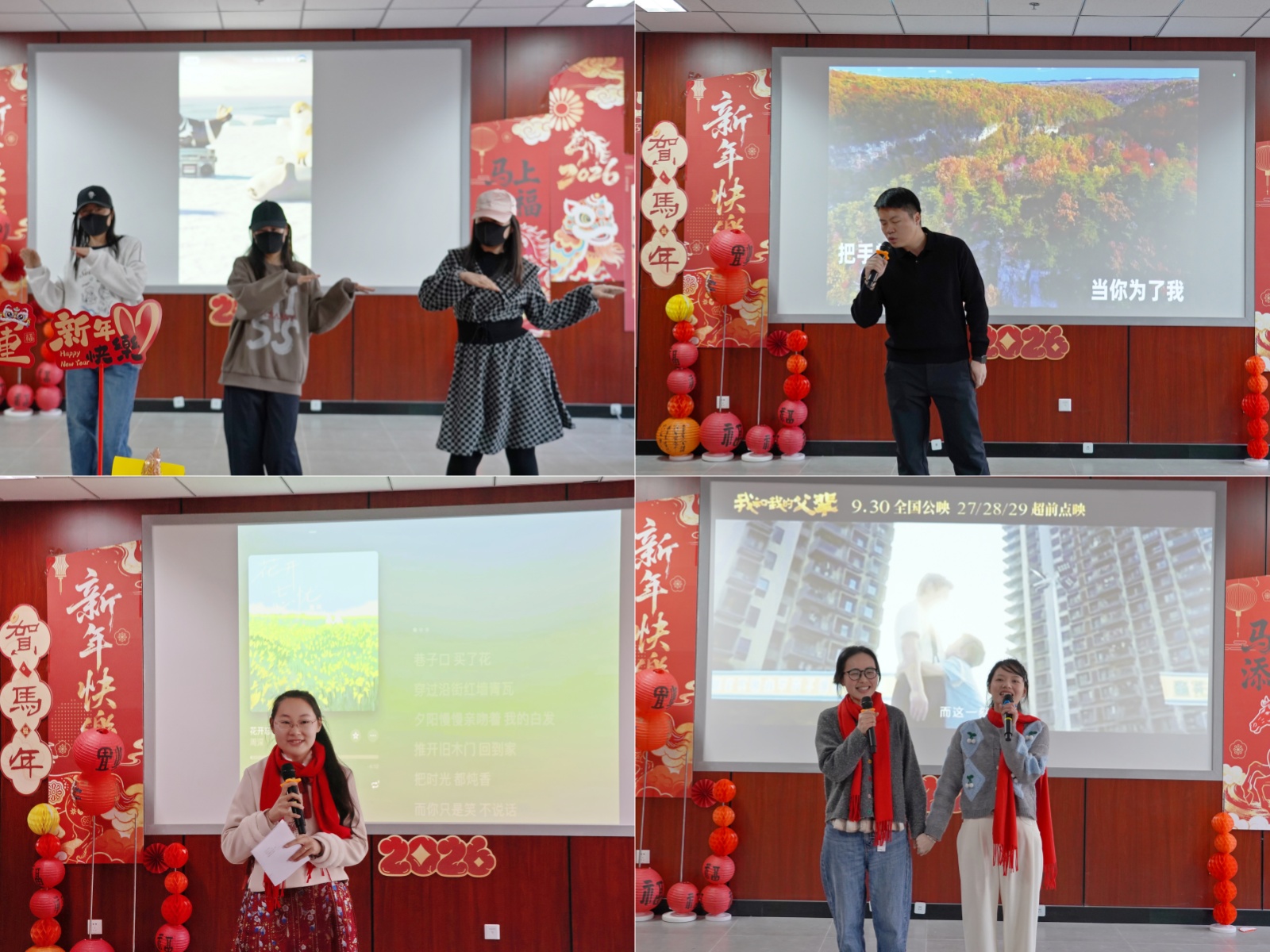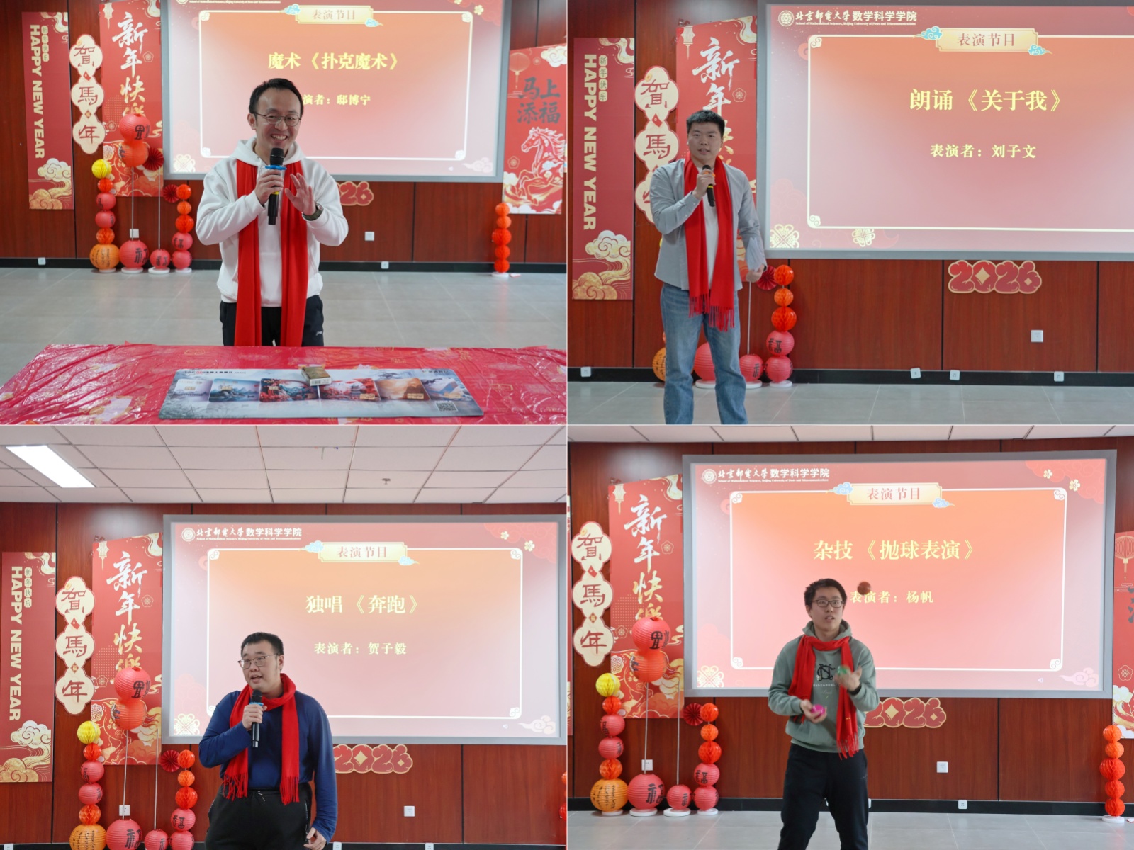 联欢活动中,精彩纷呈的文艺节目轮番上演,为现场与云端的观众带来了一场视听盛宴。灵动活泼的群舞瞬间点燃现场气氛,精妙绝伦的扑克魔术令人啧啧称奇;《光荣》《花开忘忧》《奔跑》等独唱曲目或深情婉转或激昂励志,唱出了数科院教职工的昂扬风貌;朗诵《关于我》以真挚的情感引发全场共鸣,抛球杂技表演展现出高超的技艺,赢得阵阵喝彩;合唱《如愿》将现场氛围推向高潮。期间的抽奖环节惊喜不断,线上线下的欢声笑语交织回荡,大家在轻松愉悦的氛围中共享新年喜悦。