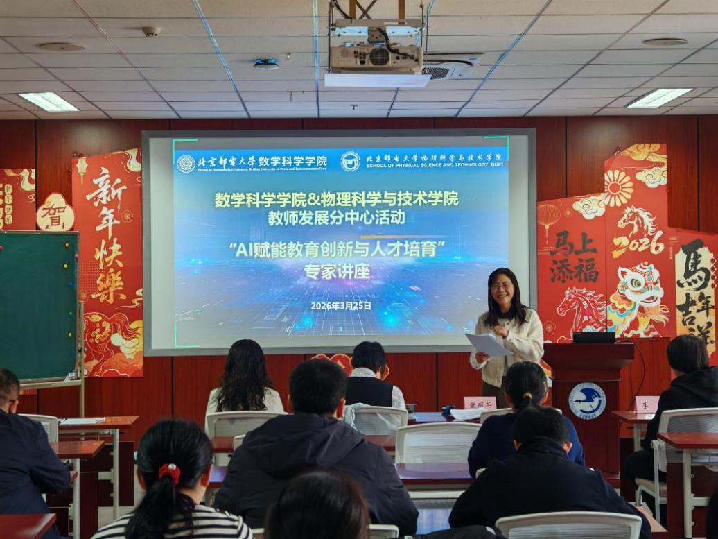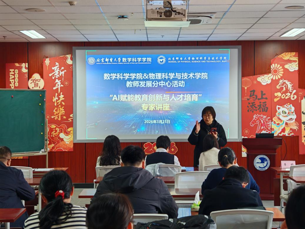 3月25日上午,“AI赋能教育创新与人才培育”活动在沙河校区理学楼302报告厅举行。本次活动由数学科学学院教师发展分中心联合物理科学与技术学院教师发展分中心共同举办。北京邮电大学数智化部副部长、计算机学院(国家示范性软件学院)鄂海红教授作专题报告,物理科学与技术学院党委副书记黄金秋出席,数学科学学院教师发展分中心副主任张丽华副教授致辞。会议由数学科学学院李鹤教授主持,两院教师代表共同参与。